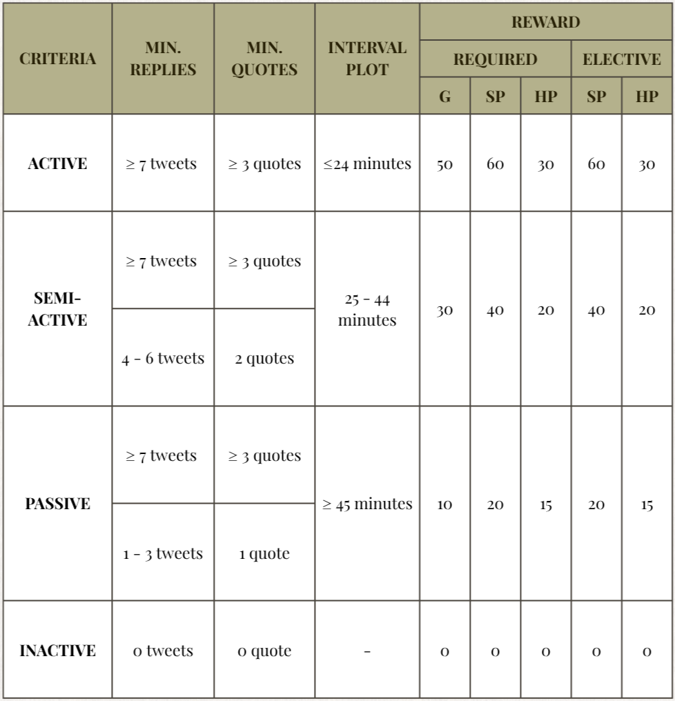 Jumlah balasan plot yang dihitung dalam skala keaktifan hanya berlaku selama rentang waktu pengajaran, yaitu antara pukul 18.25 hingga 19.40, sudah dengan toleransi tambahan 15 menit. Di luar waktu tersebut, jumlah balasan tidak akan dihitung.